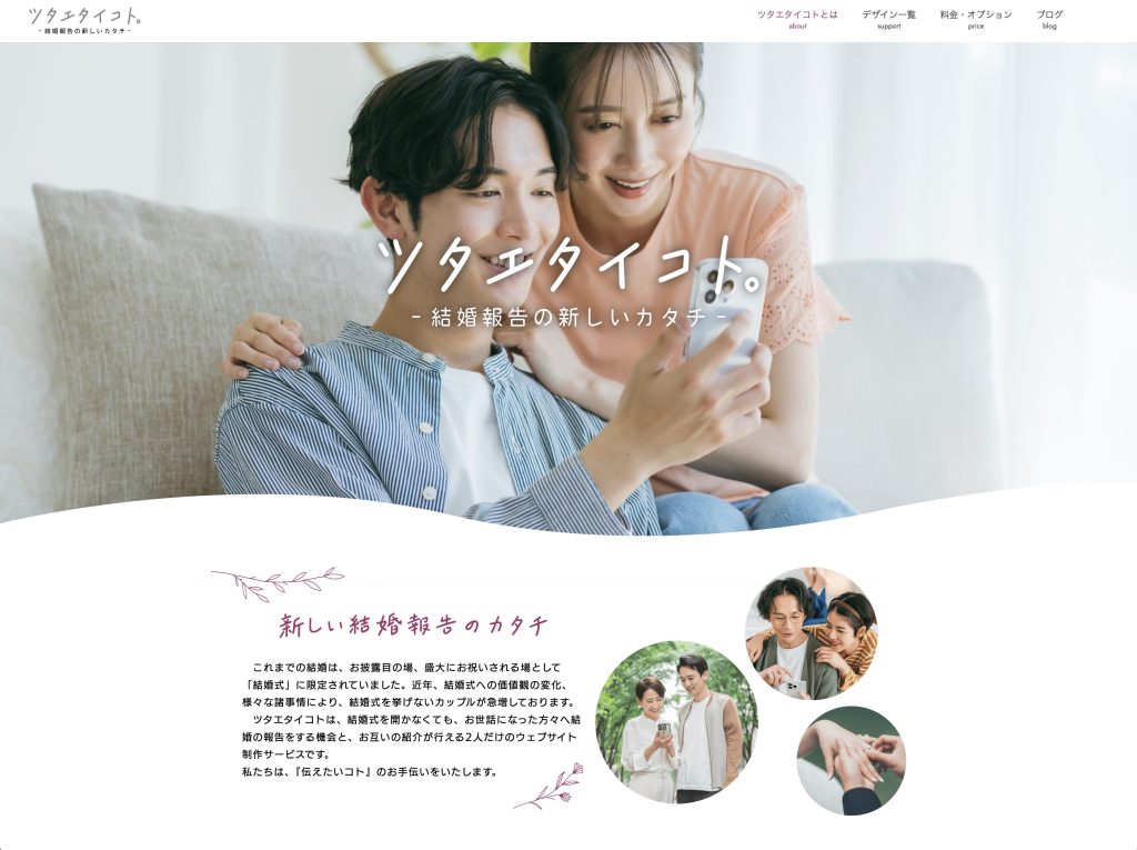 ウェブサイトの作成スマートフォンから簡単に行えます。ナシ婚を選択したカップルや、SNSでの結婚報告では物足りないと感じる方は、是非、新しい結婚報告のカタチ「ツタエタイコト」でお洒落な結婚報告サイトをご友人に送ってみてはいかがですか?